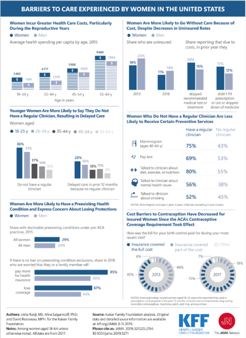 One of the biggest issues that directly impacts healthcare in general, but especially women, is affordability. According to a recent study from the Commonwealth Fund, while the number and percentage of Americans lacking health insurance is falling to historic lows, inadequate insurance remains a big problem, with over two in five working-age adults struggling to afford care: 9% of respondents reported that they were uninsured, 11% had a gap in coverage over the past year, and 23% were underinsured, meaning that while they were insured, they wouldn’t have affordable access if an issue arose. In addition, 46% of respondents skipped or delayed care because of the cost and 42% reported having problems paying medical debt or were currently paying off medical debt.