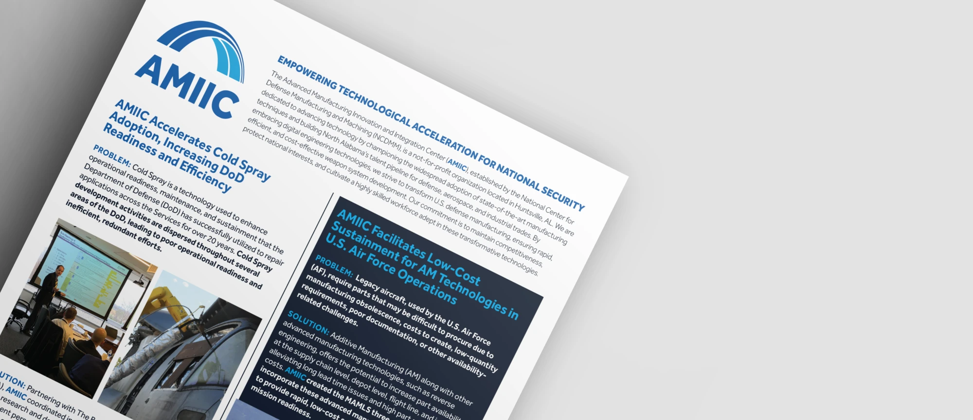 However, AMIIC was starting from scratch, with no name recognition, a lack of a communications strategy, and no established brand identity. As a newly formed collaboration between the U.S. Department of Defense and the National Center for Defense Manufacturing and Machining (NCDMM), AMIIC needed to establish credibility, build community trust, and demonstrate its national impact.